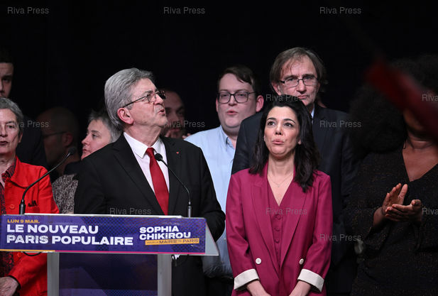 Légende : Meeting de soutien à la liste de la France Insoumise "Nouveau Paris Populaire" pour les élections municipales. Jean-Luc Mélenchon et Sophia Chikirou, candidate LFI à la mairie de Paris /// Meeting in support of the La France Insoumise list "Nouveau Paris Populaire" for the municipal elections. Jean-Luc Mélenchon and Sophia Chikirou, LFI candidate for mayor of Paris - Paris - 09/03/2026 - Photo © Lionel Préau +33 (0)6 68 12 83 77