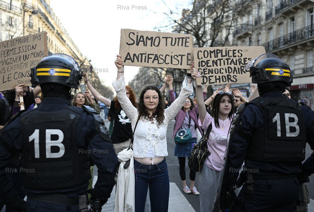 Légende : Manifestation pour les droits des femmes à l'occasion de la Journée internationale des droits des femmes. En fin de manifestation, encadré par la poilice, le collectif d'identitaires d'extrême droite Némésis, qui se revendique féministe /// Demonstration for women's rights on the occasion of International Women's Day. At the end of the demonstration, supervised by the police, the far-right identity collective Nemesis, which claims to be feminist - Paris - 08/03/2025 - Photo © Lionel Préau +33 (0)6 68 12 83 77