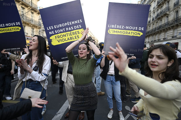 Légende : Manifestation pour les droits des femmes à l'occasion de la Journée internationale des droits des femmes. En fin de manifestation, encadré par la poilice, le collectif d'identitaires d'extrême droite Némésis, qui se revendique féministe, avec Alice Cordier, fondatrice et directrice du mouvement /// Demonstration for women's rights on the occasion of International Women's Day. At the end of the demonstration, supervised by the police, the far-right identity collective Nemesis, which claims to be feminist, with Alice Cordier, founder and director of the movement - Paris - 08/03/2025 - Photo © Lionel Préau +33 (0)6 68 12 83 77