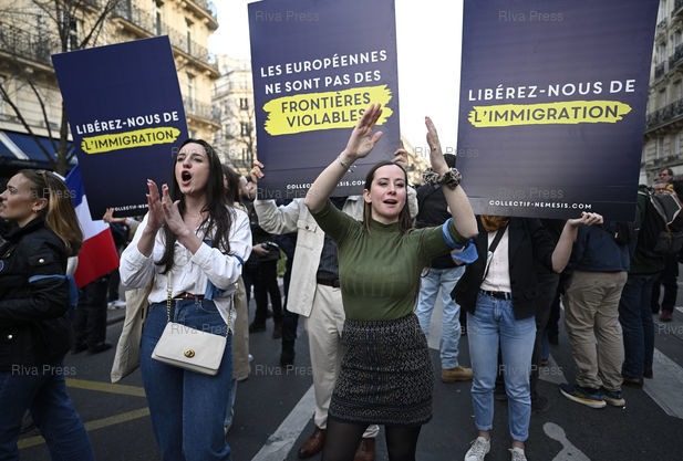 Légende : Manifestation pour les droits des femmes à l'occasion de la Journée internationale des droits des femmes. En fin de manifestation, encadré par la poilice, le collectif d'identitaires d'extrême droite Némésis, qui se revendique féministe, avec Alice Cordier, fondatrice et directrice du mouvement /// Demonstration for women's rights on the occasion of International Women's Day. At the end of the demonstration, supervised by the police, the far-right identity collective Nemesis, which claims to be feminist, with Alice Cordier, founder and director of the movement - Paris - 08/03/2025 - Photo © Lionel Préau +33 (0)6 68 12 83 77