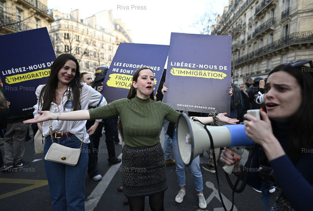 Légende : Manifestation pour les droits des femmes à l'occasion de la Journée internationale des droits des femmes. En fin de manifestation, encadré par la poilice, le collectif d'identitaires d'extrême droite Némésis, qui se revendique féministe, avec Alice Cordier, fondatrice et directrice du mouvement /// Demonstration for women's rights on the occasion of International Women's Day. At the end of the demonstration, supervised by the police, the far-right identity collective Nemesis, which claims to be feminist, with Alice Cordier, founder and director of the movement - Paris - 08/03/2025 - Photo © Lionel Préau +33 (0)6 68 12 83 77