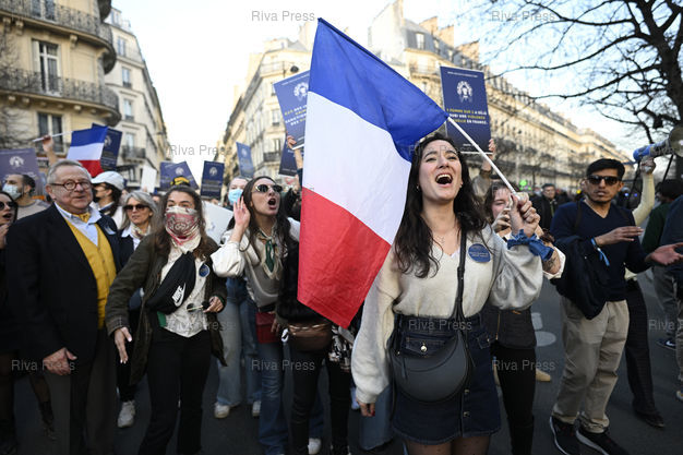 Légende : Manifestation pour les droits des femmes à l'occasion de la Journée internationale des droits des femmes. En fin de manifestation, encadré par la poilice, le collectif d'identitaires d'extrême droite Némésis, qui se revendique féministe. Anais Maréchal /// Demonstration for women's rights on the occasion of International Women's Day. At the end of the demonstration, supervised by the police, the far-right identity collective Nemesis, which claims to be feminist. Anais Maréchal - Paris - 08/03/2025 - Photo © Lionel Préau +33 (0)6 68 12 83 77