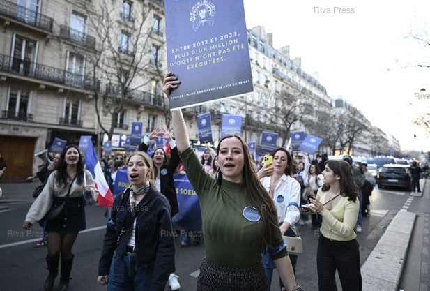 Légende : Manifestation pour les droits des femmes à l'occasion de la Journée internationale des droits des femmes. En fin de manifestation, encadré par la poilice, le collectif d'identitaires d'extrême droite Némésis, qui se revendique féministe, avec Alice Cordier, fondatrice et directrice du mouvement /// Demonstration for women's rights on the occasion of International Women's Day. At the end of the demonstration, supervised by the police, the far-right identity collective Nemesis, which claims to be feminist, with Alice Cordier, founder and director of the movement - Paris - 08/03/2025 - Photo © Lionel Préau +33 (0)6 68 12 83 77