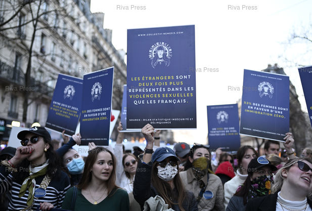 Légende : Manifestation pour les droits des femmes à l'occasion de la Journée internationale des droits des femmes. En fin de manifestation, encadré par la poilice, le collectif d'identitaires d'extrême droite Némésis, qui se revendique féministe /// Demonstration for women's rights on the occasion of International Women's Day. At the end of the demonstration, supervised by the police, the far-right identity collective Nemesis, which claims to be feminist - Paris - 08/03/2025 - Photo © Lionel Préau +33 (0)6 68 12 83 77