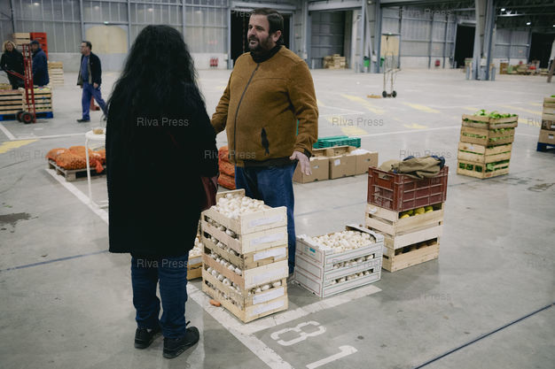 Légende : Toulouse, le 13 février 2026 - Régis Hérail, producteur d'ail, oignons et échalotes de Saint-Germain-des-près (Tarn) discute avec une cliente au Carreau des producteurs du MIN (Marché d'Intérêt National) de Toulouse où sont réunis les producteurs locaux de fruits et légumes. PHOTO: Vincent NGUYEN / Riva Press