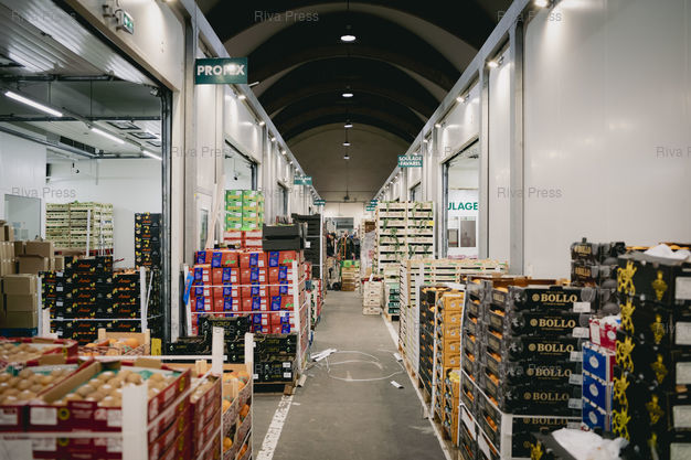 Légende : Toulouse, le 13 février 2026 - La grande halle des grossistes de fruits et légumes au MIN (Marché d'Intérêt National) de Toulouse. PHOTO: Vincent NGUYEN / Riva Press