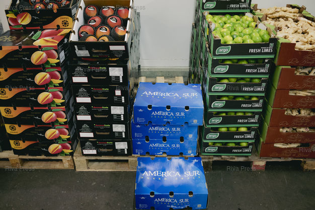 Légende : Toulouse, le 13 février 2026 - Mangues du Pérou et limes (citrons verts) et gingembre du Brésil à la grande halle des grossistes de fruits et légumes au MIN (Marché d'Intérêt National) de Toulouse. PHOTO: Vincent NGUYEN / Riva Press