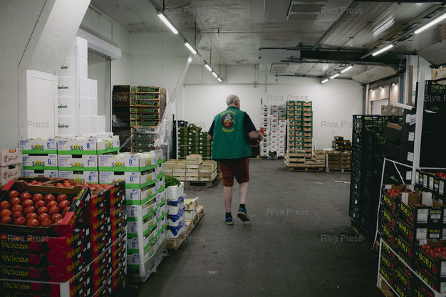 Légende : Toulouse, le 13 février 2026 - Un employé de Hortal, grossiste en fruits et légumes notamment importés d'Espagne prépare une commande à la grande halle des grossistes de fruits et légumes au MIN (Marché d'Intérêt National) de Toulouse. PHOTO: Vincent NGUYEN / Riva Press