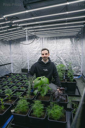 Légende : Toulouse, le 13 février 2026 - Mathis Torgue, gérant de la société Grow Deal, qui cultive des fleurs comestibles et des jeunes pousses en hydroponie dans le sous-sol du MIN (Marché d'Intérêt National) de Toulouse. PHOTO: Vincent NGUYEN / Riva Press