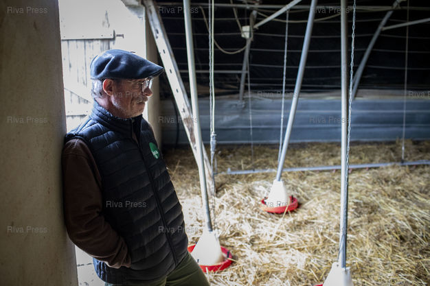Légende : Aiguillon, le 17 février 2026 - Frédéric Princic, éleveur de poulets Label rouge dans une de ses serres où sont morts les poussins qu'il élevait. Les inondations survenues le 14 février ont noyé tout son élevage soit au total 8800 poussins de 8 jours répartis en 2 bâtiments. PHOTO: Vincent NGUYEN / Riva Press