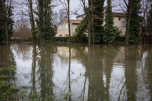 Légende : Aiguillon, le 17 février 2026 - Une maison située à proximité du Lot est entouré d'eau depuis les inondations survenues le 14 février. PHOTO: Vincent NGUYEN / Riva Press