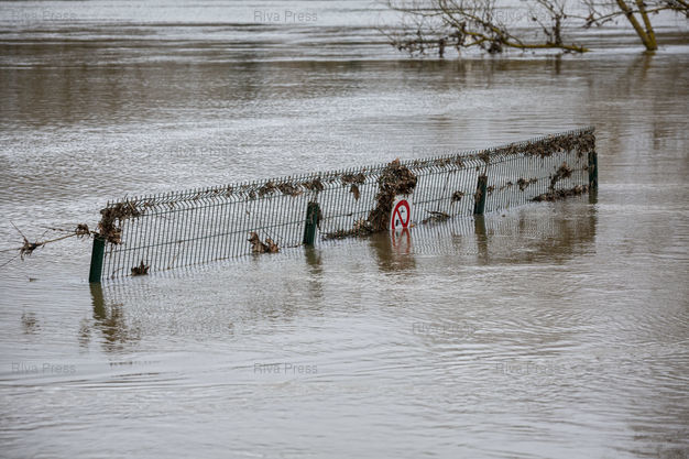 Légende : Aiguillon, le 17 février 2026 - La "plage" d'Aiguillon sur les rives du Lot est inondée par la riviére, sortie de son lit. PHOTO: Vincent NGUYEN / Riva Press