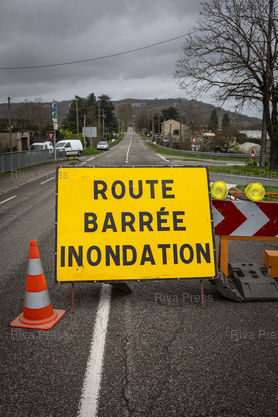 Légende : Aiguillon, le 17 février 2026 - Panneau "Route barrée inondation" sur la D813 entre Aiguillon et Nicole. PHOTO: Vincent NGUYEN / Riva Press
