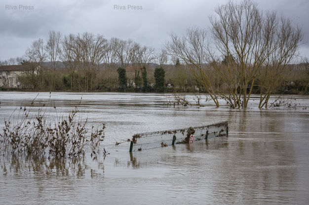 Légende : Aiguillon, le 17 février 2026 - La "plage" d'Aiguillon sur les rives du Lot est inondée par la riviére, sortie de son lit. PHOTO: Vincent NGUYEN / Riva Press