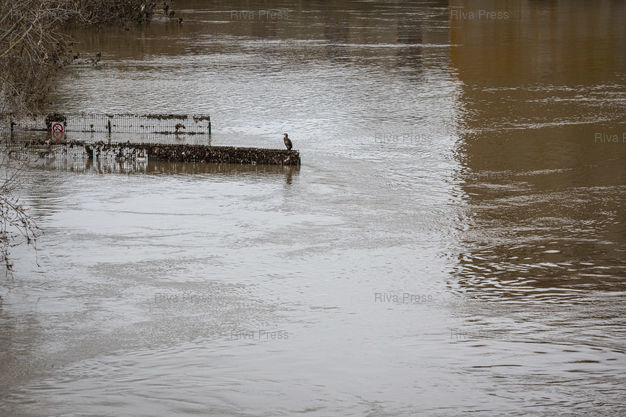 Légende : Aiguillon, le 17 février 2026 - La "plage" d'Aiguillon sur les rives du Lot est inondée par la riviére, sortie de son lit. PHOTO: Vincent NGUYEN / Riva Press