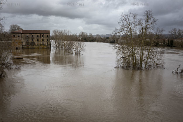 Légende : Aiguillon, le 17 février 2026 - La "plage" d'Aiguillon sur les rives du Lot est inondée par la riviére, sortie de son lit. PHOTO: Vincent NGUYEN / Riva Press