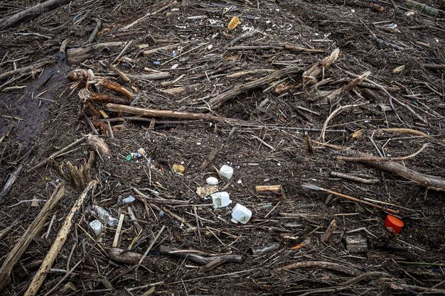 Légende : Aiguillon, le 17 février 2026 - Déchets charriés par la crue du Lot et bloqués au niveau du pont de la D813. PHOTO: Vincent NGUYEN / Riva Press