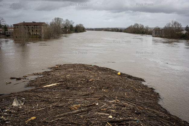 Légende : Aiguillon, le 17 février 2026 - Déchets charriés par la crue du Lot et bloqués au niveau du pont de la D813. PHOTO: Vincent NGUYEN / Riva Press