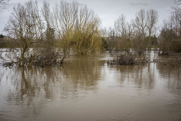 Légende : Aiguillon, le 17 février 2026 - Les rives du Lot inondées par la riviére, sortie de son lit. PHOTO: Vincent NGUYEN / Riva Press