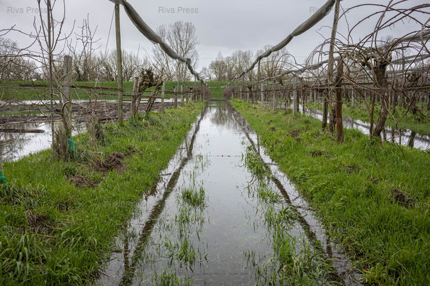 Légende : Aiguillon, le 17 février 2026 - Les champs de kiwis de Maria Frechiami. arboricultrice, sont inondés, de ce coté-ci de la digue (au fond) avec le Lot, par la remontée des eaux de la nappe phréatique. PHOTO: Vincent NGUYEN / Riva Press