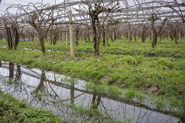 Légende : Aiguillon, le 17 février 2026 - Les champs de kiwis de Maria Frechiami. arboricultrice, sont inondés, de ce coté-ci de la digue avec le Lot, par la remontée des eaux de la nappe phréatique. PHOTO: Vincent NGUYEN / Riva Press