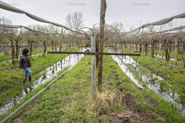 Légende : Aiguillon, le 17 février 2026 - Maria Frechiami. arboricultrice, devant ses champs de kiwis inondés, de ce coté-ci de la digue (au fond) avec le Lot, par la remontée des eaux de la nappe phréatique. PHOTO: Vincent NGUYEN / Riva Press