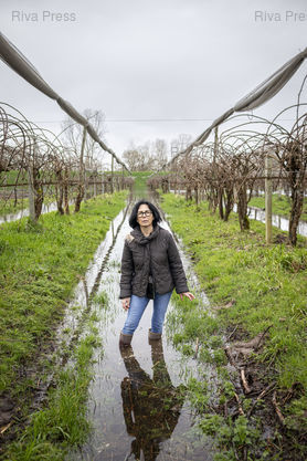 Légende : Aiguillon, le 17 février 2026 - Maria Frechiami. arboricultrice, devant ses champs de kiwis inondés, de ce coté-ci de la digue (au fond) avec le Lot, par la remontée des eaux de la nappe phréatique. PHOTO: Vincent NGUYEN / Riva Press