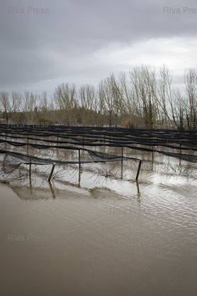 Légende : Aiguillon, le 17 février 2026 - Les champs de kiwis de Maria Frechiami. arboricultrice, sont inondés par la crue du Lot. PHOTO: Vincent NGUYEN / Riva Press
