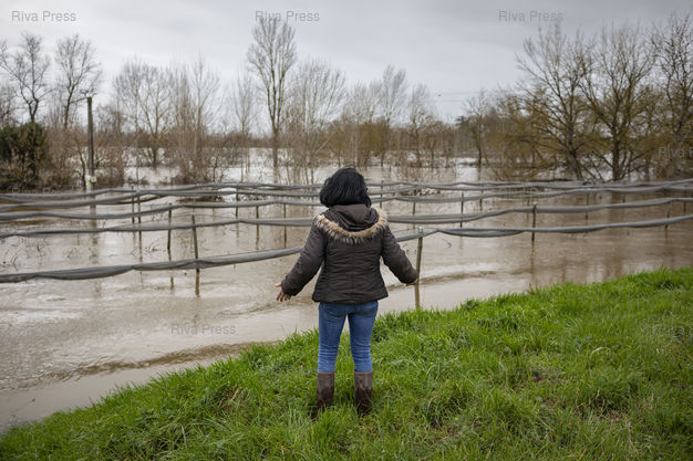 Légende : Aiguillon, le 17 février 2026 - Maria Frechiami. arboricultrice, devant ses champs de kiwis inondés par la crue du Lot. PHOTO: Vincent NGUYEN / Riva Press