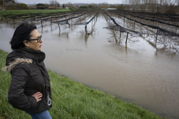 Légende : Aiguillon, le 17 février 2026 - Maria Frechiami. arboricultrice, devant ses champs de kiwis inondés par la crue du Lot. PHOTO: Vincent NGUYEN / Riva Press