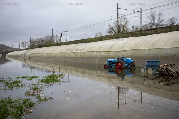 Légende : Aiguillon, le 17 février 2026 - Des serres inondées dans le quartier de l'Ile en bordure du Lot. PHOTO: Vincent NGUYEN / Riva Press