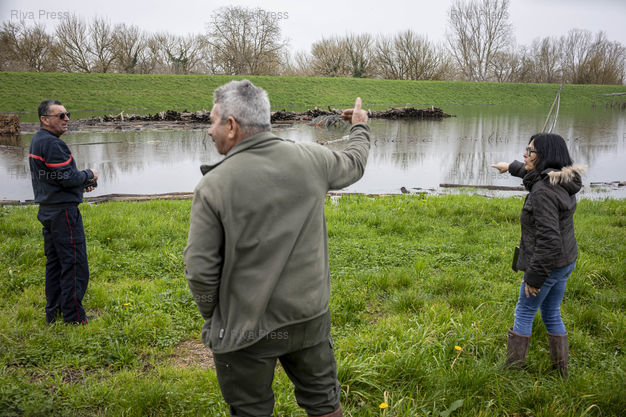 Légende : Aiguillon, le 17 février 2026 - Maria Frechiami. arboricultrice, avec un pompier venu constater l'état de la digue, devant ses champs de kiwis inondés, de ce coté-ci de la digue avec le Lot, par la remontée des eaux de la nappe phréatique. PHOTO: Vincent NGUYEN / Riva Press