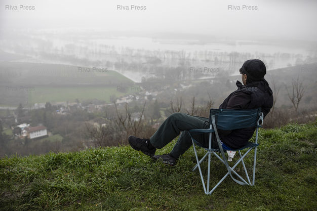 Légende : Nicole, le 17 février 2026 - De jeunes habitants de Tonneins sont venus voir la crue de la Garonne au niveau de la confluence avec le Lot entre Nicole et Aiguillon depuis le point panoramique de la Croix de Pech de Berre. PHOTO: Vincent NGUYEN / Riva Press