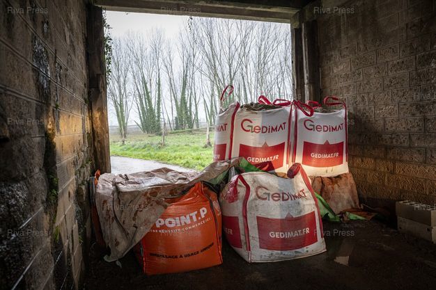 Légende : Aiguillon, le 17 février 2026 - Des ouvriers installent des sacs de sable pour boucher un accès au quartier de l'Ile évacué en raison d'une nouvelle alerte inondation faisant craindre une rupture de la digue le protégeant des eaux du Lot. Des accés situés sous un pont de chemin de fer seront bouchés pour éviter la propagation des eaux au reste de la ville. PHOTO: Vincent NGUYEN / Riva Press