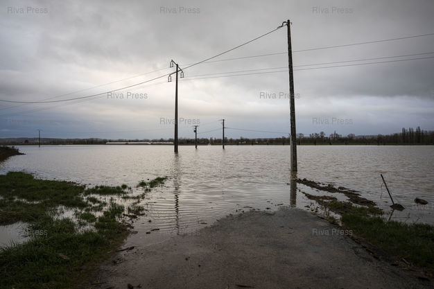 Légende : Port-Sainte-Marie, le 17 février 2026 - Une route et des champs inondés entre la D813 et la Garonne au niveau de Port-Sainte-Marie. PHOTO: Vincent NGUYEN / Riva Press