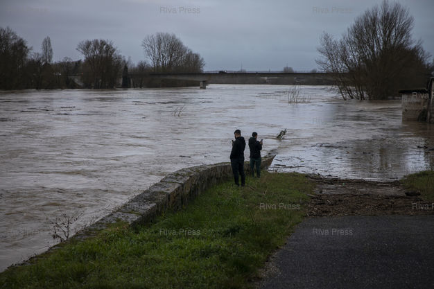 Légende : Saint-Laurent, le 17 février 2026 - Des promeneurs filment la Garonne en crue au niveau de Saint-Laurent Garonne en bordure de la D813. PHOTO: Vincent NGUYEN / Riva Press
