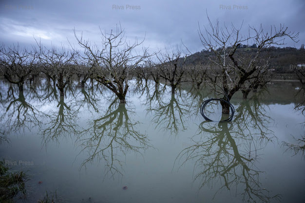 Légende : Bazens, le 17 février 2026 - Des vergers inondés situés entre la Garonne en crue et la D813 au niveau de Bazens. PHOTO: Vincent NGUYEN / Riva Press