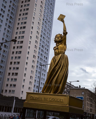 Légende : Les statues dorées des dix femmes mises à l'honneur lors des Jeux Olympiques de 2024 (représentant des figures féminines ayant marqué l'histoire de France dans les domaines du sport, des arts, des sciences, des lettres et de la politique) installées rue de la Chapelle. Ici Olympe de Gouges. Paris, le 23 février 2026. © Lucien Lung / Riva Press ***