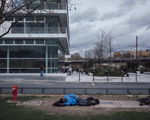 Légende : Une personne sans-abri dort devant le campus Condorcet de l'université Paris 1. Porte de la Chapelle, Paris, le 23 février 2026. © Lucien Lung / Riva Press ***