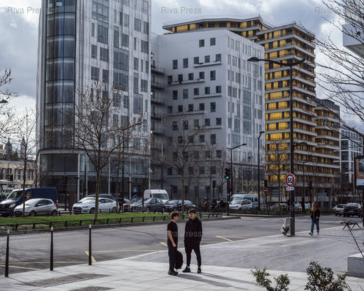 Légende : Deux étudiants discutent devant l'entrée du campus Condorcet de l'université Paris 1. Derrière eux, le quartier nouvellement construit 'Chapelle International'. Paris, le 23 février 2026. © Lucien Lung / Riva Press ***