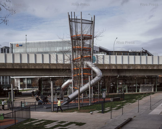Légende : Jeux pour enfants dans le jardin Hans et Sophie Scholl, construit sous le périphérique à la porte Pouchet. Paris, le 23 février 2026. © Lucien Lung / Riva Press ***