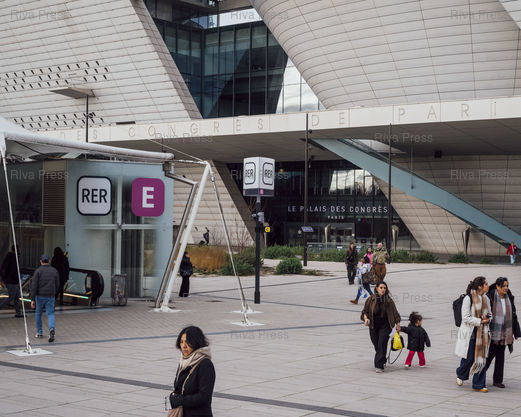 Légende : Entrée du RER E, porte Maillot, Paris, le 23 février 2026. © Lucien Lung / Riva Press ***