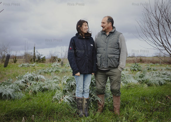 Légende : Saint-Félix-de-Rieutord le 20 février 2026 - Armand Pein et sa compagne Aude-Lise Lemercier, maraîchers bio, sur leur exploitation, ici un terrain planté d'artichauts. PHOTO: Vincent NGUYEN / Riva Press