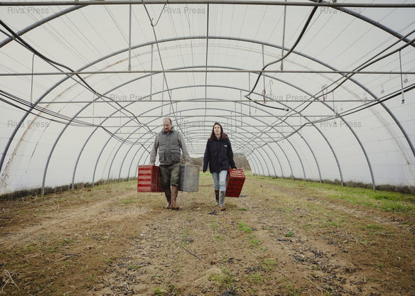 Légende : Saint-Félix-de-Rieutord le 20 février 2026 - Armand Pein et sa compagne Aude-Lise Lemercier, maraîchers bio, sur leur exploitation, ici traversant une serre en attente de culture qui sera utilisée au printemps. PHOTO: Vincent NGUYEN / Riva Press