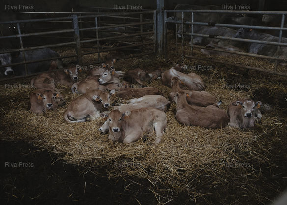 Légende : Mercus, le 20 février 2026 - Une partie des 80 veaux de l'élevage de Corentin Tourrent, éleveur de vaches gasconnes en bio. Ici dans l'étable située dans les hauteurs du village. PHOTO: Vincent NGUYEN / Riva Press