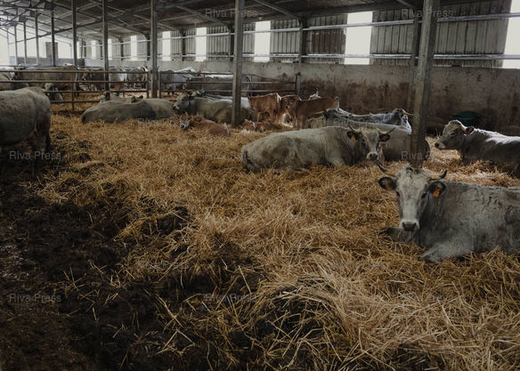 Légende : Mercus, le 20 février 2026 - Une partie des 80 veaux et vaches mères de l'élevage de Corentin Tourrent, éleveur de vaches gasconnes en bio. Ici dans l'étable située dans les hauteurs du village. PHOTO: Vincent NGUYEN / Riva Press