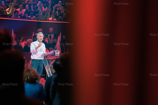 Légende : Meeting d'Emmanuel Gregoire, candidat socialiste à la tête de l'union de la gauche pour les municipales à Paris les 15 et 22 mars. Cirque d'Hiver Bouglione, Paris, 12 mars 2026. Teo Manisier / Riva Press /// Meeting of Emmanuel Gregoire, Socialist candidate leading the left-wing coalition for the Paris municipal elections on March 15 and 22. Cirque d'Hiver Bouglione, Paris, March 12, 2026. Teo Manisier / Riva Press