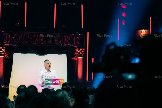 Légende : Meeting d'Emmanuel Gregoire, candidat socialiste à la tête de l'union de la gauche pour les municipales à Paris les 15 et 22 mars. Cirque d'Hiver Bouglione, Paris, 12 mars 2026. Teo Manisier / Riva Press /// Meeting of Emmanuel Gregoire, Socialist candidate leading the left-wing coalition for the Paris municipal elections on March 15 and 22. Cirque d'Hiver Bouglione, Paris, March 12, 2026. Teo Manisier / Riva Press