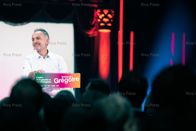 Légende : Meeting d'Emmanuel Gregoire, candidat socialiste à la tête de l'union de la gauche pour les municipales à Paris les 15 et 22 mars. Cirque d'Hiver Bouglione, Paris, 12 mars 2026. Teo Manisier / Riva Press /// Meeting of Emmanuel Gregoire, Socialist candidate leading the left-wing coalition for the Paris municipal elections on March 15 and 22. Cirque d'Hiver Bouglione, Paris, March 12, 2026. Teo Manisier / Riva Press