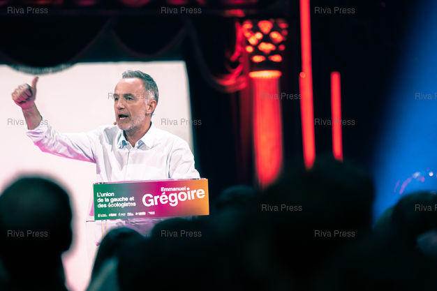 Légende : Meeting d'Emmanuel Gregoire, candidat socialiste à la tête de l'union de la gauche pour les municipales à Paris les 15 et 22 mars. Cirque d'Hiver Bouglione, Paris, 12 mars 2026. Teo Manisier / Riva Press /// Meeting of Emmanuel Gregoire, Socialist candidate leading the left-wing coalition for the Paris municipal elections on March 15 and 22. Cirque d'Hiver Bouglione, Paris, March 12, 2026. Teo Manisier / Riva Press